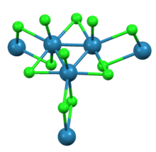 As shown by X-ray crystallography trirhenium nonachloride consists of Re3Cl12 subunits that share three chloride bridges with adjacent clusters. The interconnected network of clusters forms sheets. Around each Re center are seven ligands, four bridging chlorides, one terminal chloride, and two Re-Re bonds.[2]