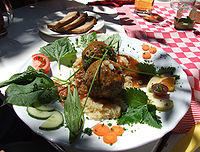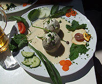 Arguably the most famous dish in Palatinate is the saumagen, literally "sow's stomach", a dish that consists of a thick, crispy-fried casing (sow stomach) stuffed with a mixture of pork, potatoes, and seasonings. Other traditional meat dishes of the region include bratwurst, Palatinate liverwurst, a blood pudding sausage called grieweworscht ("griewe" are speck (bacon) cubes, so lit. "sausage with bacon bits"), lewwerknedel (Leberknödel) (or lewwerknepp, liver dumplings), and fleeschknepp (Fleischknödel: meat dumplings). Sauerkraut is the typical side dish in all seasons, but especially in winter, as are mashed potatoes and brown gravy. Also eaten are dampfnudels, which can be served with either sweet sauces or side dishes (such as wine, vanilla sauce or canned fruit such as plums, prunes, or pears) or with savory side dishes (such as potato soup, vegetable soup, goulash, or pepper pork).