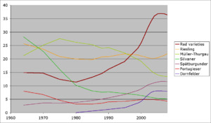 As a wine country, Germany has a mixed reputation internationally, with some consumers on the export markets associating Germany with the world's most elegant and aromatically pure white wines while other see the country mainly as the source of cheap, mass-market semi-sweet wines such as Liebfraumilch.[2] Among enthusiasts, Germany's reputation is primarily based on wines made from the Riesling grape variety, which at its best is used for aromatic, fruity and elegant white wines that range from very crisp and dry to well-balanced, sweet and of enormous aromatic concentration. While primarily a white wine country, red wine production surged in the 1990s and early 2000s, primarily fuelled by domestic demand, and the proportion of the German vineyards devoted to the cultivation of dark-skinned grape varieties has now stabilized at slightly more than a third of the total surface. For the red wines, Spätburgunder, the domestic name for Pinot noir, is in the lead.