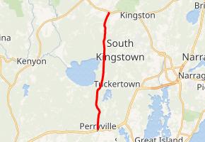 Route 110 begins at US 1 near the village of Perryville in the town of South Kingstown. The route heads north for 7 miles (11 km) following Ministerial Road through the wetlands of the Great Swamp. Along the way it intersects with the William C. O'Neill Bike Path Soon after crossing some railroad tracks, Route 110 ends at an intersection with Route 138 in the village of West Kingston.