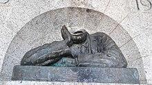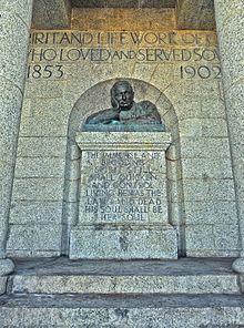 At the bottom of the steps is a bronze statue of a horseman, Physical Energy by George Frederic Watts. Eight bronze lions by John Macallan Swan flank the steps leading up to the memorial, with a bust of Rhodes (also by JM Swan).[2] The inscription on the monument is "To the spirit and life work of Cecil John Rhodes who loved and served South Africa." Inscribed below the bust of Rhodes are the last four lines of the last stanza from the 1902 poem Burial by Rudyard Kipling in honour of Rhodes: