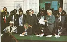 Talks aimed at easing the differences between Rhodesia and the United Kingdom were carried out aboard Royal Navy vessels once in December 1966 and again in October 1968.[66][67][68] Both efforts failed to achieve agreement, although Harold Wilson added a sixth principle to the five he had previously enunciated: "it would be necessary to ensure that, regardless of race, there was no oppression of the majority by the minority or of [any] minority by the majority." Rhodesian resolve stiffened following a failure to reach a new settlement, with more radical elements of the Rhodesian Front calling for a republican constitution.[6]