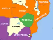 Rhodesia (/roʊˈdiːʒə/, /roʊˈdiːʃə/),[1] officially from 1970 the Republic of Rhodesia,[2] was an unrecognised state in Southern Africa from 1965 to 1979, equivalent in territory to modern Zimbabwe. Rhodesia was the de facto successor state to the British colony of Southern Rhodesia, which had been self-governing since achieving responsible government in 1923. A landlocked nation, Rhodesia was bordered by South Africa to the south, Bechuanaland (later Botswana) to the southwest, Zambia to the northwest, and Mozambique (a Portuguese province until 1975) to the east.