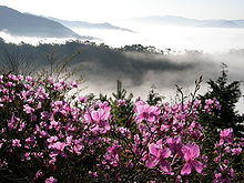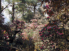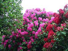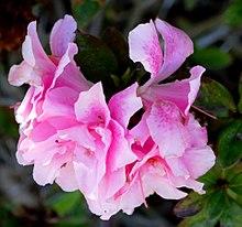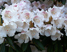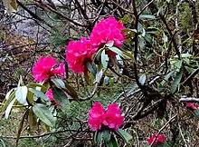 Rhododendron /ˌroʊdəˈdɛndrən/ (from Ancient Greek ῥόδον rhódon "rose" and δένδρον déndron "tree")[4][5] is a genus of 1,024 species of woody plants in the heath family (Ericaceae), either evergreen or deciduous, and found mainly in Asia, although it is also widespread throughout lowland and montane forests in the Pacific Northwest, California, the Northeastern United States, and especially in the highlands of the Appalachian Mountains of North America. It is the national flower of Nepal, the state flower of Washington and West Virginia in the United States, the provincial flower of Jiangxi in China and the state tree of Sikkim and Uttarakhand in India. Most species have brightly colored flowers which bloom from late winter through to early summer.[6]