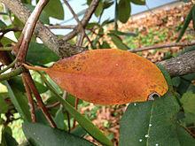 In the later traditional classification, attributed to Chamberlain (1996), and as used by horticulturalists and the American Rhododendron Society,[44] Rhododendron has eight subgenera based on morphology, namely the presence of scales (lepidote), deciduousness of leaves, and the floral and vegetative branching patterns, after Sleumer (1980).[2][11][30] These consist of four large and four small subgenera. The first two subgenera (Rhododendron and Hymenanthes) represent the species commonly considered as 'Rhododendrons'. The next two smaller subgenera (Pentanthera and Tsutsusi) represent the 'Azaleas'. The remaining four subgenera contain very few species.[45] The largest of these is subgenus Rhododendron, containing nearly half of all known species and all of the lepidote species.