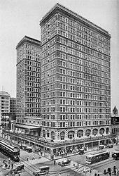 The hotel had been losing money and its taxes unpaid. Jesse H. Jones offered to lease the land from the Rice Institute and replace the existing hotel through his company, the Houston Hotel Association. Jones obtained a ninety-nine year lease with an option for a ninety-nine year extension. The Rice Institute also invested funds from its endowment to assist Jones in building a new hotel. After demolishing the original Rice Hotel in 1912, Jones hired Mauran, Russell & Crowell to design the new hotel. The new seventeen-story, C-shaped (or U-shaped) hotel opened in May 1913.[3] The hotel featured four restaurants, a banquet room, a small concert hall, and a rooftop deck. The construction cost was about $3.5 million, equivalent to $64,000,000 in 2016.[10]