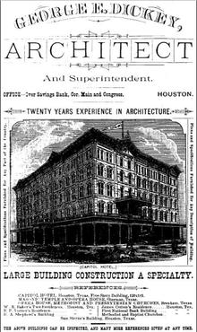 Abraham Groesbeck razed the original building and constructed a five-story Victorian hotel in 1881.[3] The building, then known as the Capitol Hotel, was designed by George E. Dickey, and represented his first major commission since relocating to Houston in 1878.[7]