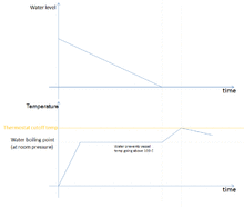 The bowl is filled with rice and water and heated at full power; the water reaches and stays at boiling point (100 °C, 212 °F).[1] When the water has all been absorbed, the temperature can rise above boiling point, which trips the thermostat. Some cookers switch to low-power "warming" mode, keeping the rice at a safe temperature of approximately 65 °C (150 °F); simpler models switch off; the rice has entered the resting phase.