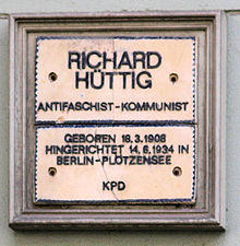 Richard Hüttig (18 March 1908 in Roßleben-Bottendorf – 14 June 1934 in Berlin, executed) was a prewar German Communist who was put to death, apparently more for his political convictions than for any crime he committed.