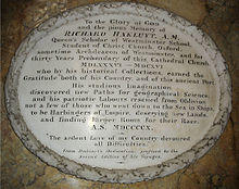 - ^ There does not appear to be any monument to Hakluyt either in Christ Church Cathedral, Oxford, or elsewhere in the grounds of Christ Church, Oxford.