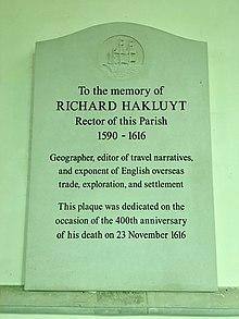 - ^ a b McHenry, Patrick (2 November 2004). "Richard Hakluyt". The Literary Encyclopedia. Retrieved 21 April 2007.