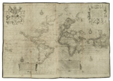 Between 1598 and 1600 appeared the final, reconstructed and greatly enlarged edition of The Principal Navigations, Voiages, Traffiques and Discoueries of the English Nation in three volumes. In the dedication of the second volume (1599) to his patron, Robert Cecil, 1st Earl of Salisbury, Hakluyt strongly urged the minister as to the expediency of colonising Virginia.[5] A few copies of this monumental work contain a map of great rarity, the first on the Mercator projection made in England according to the true principles laid down by Edward Wright. Hakluyt's great collection has been called "the Prose Epic of the modern English nation" by historian James Anthony Froude.[18]