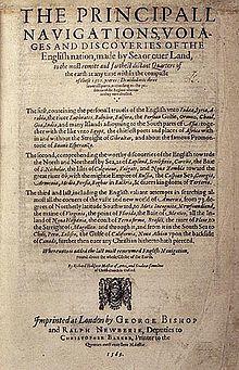 - Hakluyt, Richard (1589). The Principall Navigations, Voiages, and Discoveries of the English Nation: Made by Sea or Over Land to the Most Remote and Farthest Distant Quarters of the Earth at Any Time within the Compasse of These 1500 Years: Divided into Three Several Parts According to the Positions of the Regions Whereunto They Were Directed; the First Containing the Personall Travels of the English unto Indæa, Syria, Arabia ... the Second, Comprehending the Worthy Discoveries of the English Towards the North and Northeast by Sea, as of Lapland ... the Third and Last, Including the English Valiant Attempts in Searching Almost all the Corners of the Vaste and New World of America ... Whereunto is Added the Last Most Renowned English Navigation Round About the Whole Globe of the Earth. London: Imprinted by George Bishop and Ralph Newberie, deputies to Christopher Barker, printer to the Queen's Most Excellent Majestie. Folio. Reprint: