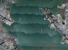 A third bridge was proposed in late 1927 by the enigmatic T.A. Tomasini.[18] Tomasini's 1927 bridge called for two lanes of automobile traffic straddling a central rail line from San Pedro Hill (Marin) to San Pablo station (Contra Costa), a distance of over 5 miles (8.0 km).[19] In 1928, Tomasini presented a revised proposal for a bridge farther south than the other two bridges—spanning the water from Albany (in Alameda County) to Tiburon. The 1928 Tomasini Albany–Tiburon bridge was the longest of the three proposed bridges by a significant margin.[9][20] The proposed Albany–Tiburon bridge would have been similar in concept to the 1967 San Mateo–Hayward Bridge, with a high-level western section approximately 7,700 feet (2,300 m) long transitioning to a low-level eastern causeway. The western section featured two 1,000-foot-wide (300 m) spans to cross the navigation channels, with the western navigation span having a minimum vertical clearance of 150 feet (46 m) and the eastern navigation span having a minimum vertical clearance of 135 feet (41 m).[21] The 1,000-foot-wide (300 m) navigation channels for the proposed Albany–Tiburon bridge were opposed by shipping interests, who wanted the channels to be 1,500 feet (460 m) wide instead. The cost of the longer spans required would have made the proposed Albany–Tiburon bridge impractical, and Tomasini argued that "any mariner who could not negotiate a bridge such as proposed should lose his license."[22]