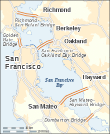 The Richmond–San Rafael Bridge (also officially named the John F. McCarthy Memorial Bridge[3]) is the northernmost of the east–west crossings of the San Francisco Bay in California, USA. Officially named after California State Senator John F. McCarthy, it bridges Interstate 580 from Richmond on the east to San Rafael on the west. It opened in 1956, replacing ferry service by the Richmond–San Rafael Ferry Company.[4]