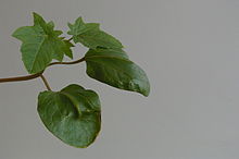 The glossy leaves are 15–45 cm (6–18 in) long, long-stalked, alternate and palmate with five to twelve deep lobes with coarsely toothed segments. In some varieties they start off dark reddish purple or bronze when young, gradually changing to a dark green, sometimes with a reddish tinge, as they mature. The leaves of some other varieties are green practically from the start, whereas in yet others a pigment masks the green color of all the chlorophyll-bearing parts, leaves, stems and young fruit, so that they remain a dramatic purple-to-reddish-brown throughout the life of the plant. Plants with the dark leaves can be found growing next to those with green leaves, so there is most likely only a single gene controlling the production of the pigment in some varieties.[10] The stems and the spherical, spiny seed capsules also vary in pigmentation. The fruit capsules of some varieties are more showy than the flowers.