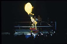 After a victory over Hercules Hernandez at the Los Angeles portion of WrestleMania 2,[24] Steamboat began his next feud with Jake "The Snake" Roberts. Their feud began when Roberts attacked him before their match on the May 3 Saturday Night's Main Event VI, which did not occur due to Roberts assaulting Steamboat.[25][26] Roberts was initially reluctant to deliver the DDT on the concrete floor due to his fear that Steamboat would not be able to stop his head from hitting the floor, which, on this particular occasion, was not covered with protective mats. Vince McMahon and booker George Scott were adamant that the spot take place outside the ring. Only after assurances by Steamboat that he would protect himself did Roberts agree to it. However, Roberts' fears came true and Steamboat was legitimately knocked out when his forehead hit the concrete. Roberts later described the sound as like a watermelon bursting.[27] They later battled each other in a Snake Pit match (no DQ) in front of 74,000 fans at The Big Event in Toronto, Ontario, Canada, which Steamboat won with a small package despite Roberts dominating virtually the entire match to that point.[28] Their feud finally ended on the October 4 Saturday Night's Main Event VII, when Steamboat defeated Roberts in their Snake Pit rematch.[29] Following the match, Roberts continued to attack Steamboat and was about to place his snake Damien on him, but Steamboat took his crocodile out of his bag and scared Roberts from the ring.[30]