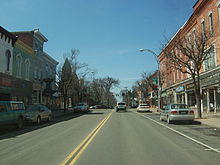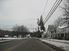 In Wolcott, the path of Ridge Road is known by several names as it traverses the industrial western half of the community—based around a spur of the Ontario Midland Railroad—and its residential eastern portion. It remains West Main Street until New Hartford Street, at which point it becomes just Main Street. One block later, Main Street splits into East Main Street and Mill Street, with Ridge Road following the latter northeast across Wolcott Creek. On the opposite bank of the creek, Mill Street meets Auburn Street,[18] formerly the northernmost part of NY 89,[20] and changes names one last time to Oswego Street.[18] The street leaves Wolcott village on an easterly routing, becoming CR 163 and Ridge Road at the eastern village line.[19]