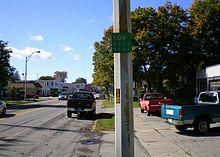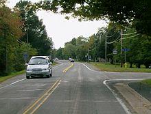Most of Ridge Road between Lewiston and the city of Rochester 70 miles (113 km) to the east passes through rural, outlying areas of Niagara, Orleans, and western Monroe counties. While NY 31, a parallel highway 5 miles (8 km) to the south, passes through most of the region's largest communities—including the city of Lockport and the villages of Medina, Albion, and Brockport—Ridge Road and NY 104 bypass them entirely. Instead, the two-lane road passes through only small hamlets built up around junctions between NY 104 and other state routes.[5] This changes in central Monroe County, however, where Ridge Road (known locally as West Ridge Road) is six to nine lanes wide[6] as it serves as the backbone of a large commercial district in the town of Greece.[7] Once in Rochester, West Ridge Road enters areas more residential and industrial in nature, including the sprawling Eastman Business Park near the Genesee River.[8]
