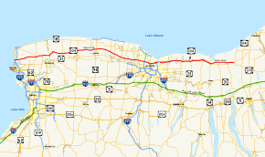 Ridge Road is a 121.5-mile (195.5 km) east–west road that traverses four counties in Upstate New York in the United States. The road begins adjacent to the Niagara River at an intersection with Water Street in Lewiston, Niagara County, and passes through several towns, villages, and the city of Rochester before arriving at its eastern terminus at a junction with New York State Route 370 (NY 370) southwest of Red Creek, Wayne County. It is named for the rise atop which the road was built, a mound of sand and gravel that was formed when it was the shoreline of ancient Glacial Lake Iroquois (now Lake Ontario). The ridge is often confused with the nearby Niagara Escarpment, which is much taller, geologic in origin, and lies a few miles to the south.