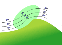 Ridge lift is generated when the wind blows against a hill, ridge, escarpment or ocean wave, causing the air to rise. In meteorology this is known as orographic lift. The wind creates a region of rising air directly above the slope, which may extend some distance upwards and outwards from its face because the airflow follows the upward contour of the hill. However, at near vertical cliffs, there is usually an area of turbulence with descending air near the base of the cliff. Downwind of the hill, lee waves can form; these are also used by glider pilots to gain height, but this should not be confused with slope lift.