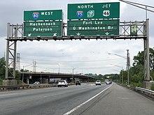 The initial 118 miles (190 km) of the New Jersey Turnpike were completed in 1952, with the original northern terminus at an interchange connecting to Route 46 in Ridgefield.[36] An additional four-mile stretch of road connecting the Turnpike from Ridgefield to Interstate 80 in Teaneck and from there to the George Washington Bridge was completed in 1964. The western spur was added in the 1970s, with its two spurs re-connecting in the western side of the borough.