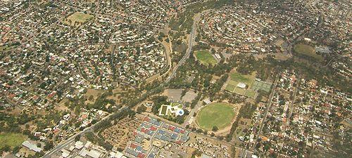 Aerial image of the northwestern part of Ridgehaven, looking northwest. Grenfell Road is the east-west road that is sloping downwards in the picture, and the north-south road that is visible is Golden Grove Road. Milne Road is indicated by the red arrow. Ridgehaven is the area to the west of Golden Grove Way and south of Milne Road, the half of the image in the bottom right. The blue and red roofed complex is the Masonic Village, and the green ovals to the north are part of Modbury Sports Reserve. Redwood Park is to the north of Milne Road, and Modbury Heights is to the left.