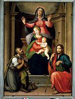 Ridolfo's masterpieces include a number of altarpieces, including the Madonna della Cintola (1503–09) over the door of the cathedral in Prato; the Way to Calvary for the church of San Gallo, Florence (now London, National Gallery); the Coronation of the Virgin (1504), originally at San Jacopo di Ripoli, Florence, and now at the Musée du Petit Palais, Avignon; and the Nativity for the cathedral in Basel, Switzerland, and now at the Museum of Fine Arts in Budapest.[1] For the Oratory of the Bigallo, Florence, he painted the predella (1515) to its venerated altarpiece; this predella consists of five panels representing the Nativity, Flight into Egypt, Madonna of Mercy and other subjects such as the Bigallo performing charitable burials. He painted several altarpieces for the hospital of Santa Maria Nuova, Florence, and its dependencies.[2]