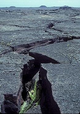 A rift zone is a feature of some volcanoes, especially shield volcanoes, in which a set of linear cracks (or rifts) develops in a volcanic edifice, typically forming into two or three well-defined regions along the flanks of the vent.[1] Believed to be primarily caused by internal and gravitational stresses generated by magma emplacement within and across various regions of the volcano, rift zones allow the intrusion of magmatic dykes into the slopes of the volcano itself. The addition of these magmatic materials usually contributes to the further rifting of the slope, in addition to generating fissure eruptions from those dykes that reach the surface. It is the grouping of these fissures, and the dykes that feed them, that serves to delineate where and whether a rift zone is to be defined.[2] The accumulated lava of repeated eruptions from rift zones along with the endogenous growth created by magma intrusions causes these volcanoes to have an elongated shape.[3] Perhaps the best example of this is Mauna Loa, which in Hawaiian means "long mountain",[4] and which features two very well defined rift zones extending tens of kilometers outward from the central vent.