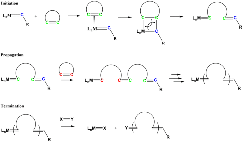 The mechanism for ROMP follows similar pathways as olefin metathesis. The initiation process involves the coordination of the cycloalkene monomer to the metal alkylidene complex, followed by a [2+2] type cycloaddition to form the metallacyclobutane intermediate that cycloreverts to form a new alkylidene species.[17][18]