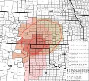 Map of states and counties affected by the Dust Bowl between 1935 and 1938 originally prepared by the Soil Conservation Service. The most severely affected counties are colored .