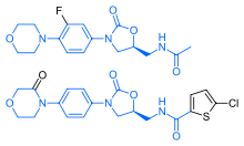 Rivaroxaban bears a striking structural similarity to the antibiotic linezolid: both drugs share the same oxazolidinone-derived core structure. Accordingly, rivaroxaban was studied for any possible antimicrobial effects and for the possibility of mitochondrial toxicity, which is a known complication of long-term linezolid use. Studies found that neither rivaroxaban nor its metabolites have any antibiotic effect against Gram-positive bacteria. As for mitochondrial toxicity, in vitro studies published before 2008 found the risk to be low.[33]