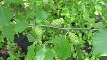 The twigs are glabrous or thinly hairy. There is an absence of terminal buds, and lateral buds often have a hook at the tip of the bud, which differs from other species in the family Betulaceae.[4] The leaves are alternate, ovate, 4–8 centimeters (1 1&fras1;2–3 1&fras1;4 in) long and 3–6 centimeters (1 1&fras1;4–2 1&fras1;4 in) broad, with a serrated margin and five to twelve pairs of veins. The upper surface of the leaf is dark green in color, while the underside can be described as having a light yellow-green color.[5] The leaves turn yellow in Autumn. The flowers are wind-pollinated catkins 3–6 centimeters (1 1&fras1;4–2 1&fras1;4 in) long, the male catkins pendulous, the female catkins erect. The fruit is unusual among birches in maturing in late spring; it is composed of numerous tiny winged seeds packed between the catkin bracts.[2][6]