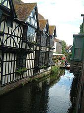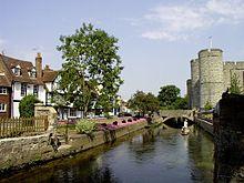 The historic city of Canterbury lies at the junction of four branches of the Roman road Watling Street which connected Canterbury with ports around the Kent coast – Lympne, Dover, Richborough and Reculver. Within the city the river flows in two channels, one through the centre of the city, and the other to the north of the city walls. The two channels rejoin to the east of Canterbury, before the river reaches Fordwich, a former outport of Canterbury and the current tidal limit of the river.