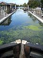 By 1571, the river was an important route for the carriage of grain to London, and the City of London obtained another act to authorise improvements. This included making new cuts, and creating towpaths on both sides of the river. Shoals were removed, and a cut, probably the section which is now called Bow River from Old Ford Locks to Bow Locks, was excavated, which was not subject to any tolls. The plan for a branch from the river to the north of London was not implemented.[4] One innovation was the construction of a pound lock at Waltham Abbey, Essex, in 1577. This had mitred gates at each end,[5] and was probably the second lock to be built in England, although it was the first to be built on a river. It inspired Vallens to write a poem entitled "A tale of Two Swannes" about it in 1590. It was 70 by 24 feet (21.3 by 7.3 m), with wooden sides.[6] The remainder of the control of levels was carried out by "staunches" or "turnpikes", consisting of a single vertically lifting gate in a weir, through which boats were pulled against the current.