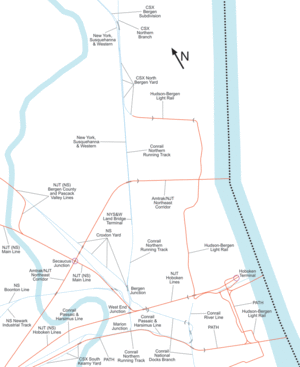 The River Line was abandoned east and south of the Tonnelle Avenue overpass at the North Bergen yard. The short connection between the National Docks Secondary and the River Line was also abandoned, as was the Weehawken Branch.[1]