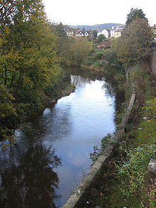 The Monnow rises near Craswall on Cefn Hill just below the high Black Mountains, Wales. It flows southwards, gaining the waters of its tributaries the Escley Brook and Olchon Brook near Clodock and the waters of the River Honddu,[1] from the Welsh side of the Black Mountains, near Pandy. The river then flows briefly eastwards, to Pontrilas, where it is joined by its largest tributary, the River Dore before again turning southwards. At Monmouth, the Monnow joins into the River Wye with the River Trothy. The unique medieval Monnow Bridge in Monmouth is the only remaining fortified river bridge in Great Britain with its gate tower standing on the bridge.