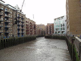 During the Middle Ages, the local religious house, Bermondsey Abbey, made use of the water of the Neckinger to power a Tide mill.[4] The mill's early name was Redriff,[15] also an early name for the present neighbouring district of Rotherhithe,[16][17] On 31 June 1536, the Abbey leased the mill to John Curlew,[18] but the Dissolution of the Monasteries saw it privately acquired.[15] At this time the Neckinger was navigable from the Thames up to the Abbey grounds.[19]