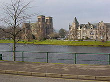 Upstream of Inverness city centre lie the Ness Islands which are popular for nature walks and have many fine tree specimens.[10][11] The river flows through the heart of the City of Inverness, and fishermen in waders can often be seen casting for salmon. The Ness District Salmon Fishery Board is the statutory body responsible for the protection and enhancement of salmon and sea trout fisheries in the Ness District.[12] Common seals and grey seals are often seen, as are grey heron, pipistrelle and Daubenton's bats, housemartins, grey wagtail, great black backed gull, European herring gull, oystercatchers, mallards, dippers, goosander and other diving birds. At certain times of the year Arctic terns can be seen lining the railings along the river banks and rarely eagle owl have been seen and the occasional osprey has been spotted fishing in the river from the Ness Islands. European otter are sometimes spotted. The banks of the river are lined with lime trees.[13]