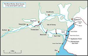 Disaster occurred on Lady Day 1644, when an exceptionally high tide flooded the Upper Levels, and broke through the walls of the New Salt Channel. The Commissioners authorised the construction of a new sea sluice at Kent Wall, and work began in May 1646, but in September, they decided that it should be built at Blackwall instead. The height of Knelle Dam was regularly adjusted, in an attempt to manage the amount of water that still flowed along the Appledore Channel, and the conflicting needs of navigation and drainage. The Great Freshwater Sluice below Appledore deteriorated, and failed in 1650. A new sluice with three channels was built in 1669. The financial burden on the Upper Levels as a result of the sea entering the Wittersham Levels was huge, as they had to pay rent on all land that was not available to its original owners,[16] and so in 1671, an agreement was reached that the sea would be excluded from the levels. Work began in 1680 to enclose areas of land on both sides of the valley, and was largely completed by 1684. The work included a new embanked channel for the Rother, which was built along the southern edge of the valley. It was called the Craven Channel, and ended at Craven Sluices.[17]