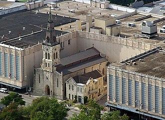 The landmark 1871 St. Joseph's Catholic Church did not sell to the original developers, Joske's Department Store, in 1945, and the store was built around it.