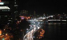 Construction on the Riverside Expressway began in late 1968, when the pylons for the bridge were laid on the north bank of the Brisbane River. It was built over the former Short Street which provided access to a wharf.[3] The bridge was completed in 1975 as was the Southeast Freeway to Holland Park.[1] The Brisbane River was used as a source for gravel to make much of the concrete used in construction.