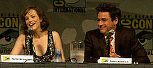 In 2003, Downey met producer Susan Levin, an Executive Vice President of Production at Joel Silver's film company, Silver Pictures on the set of Gothika.[12] Though Susan twice turned down his amorous advances, she and Downey did quietly strike up a romance during production.[130] Despite Susan's worries that the romance would not last after the completion of shooting because "he's an actor; I have a real job",[130] the couple's relationship continued after production wrapped on Gothika, and Downey proposed to Susan on the night before her thirtieth birthday.[130] In August 2005, the couple were married, in a Jewish ceremony, at Amagansett, New York.[131][132] A tattoo on one of his biceps reads "Suzie Q" in tribute to her.[133] Their first child, a son named Exton Elias, was born in February 2012,[134] and their second, a daughter named Avri Roel, was born in November 2014.[135][136][137]