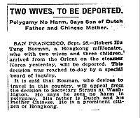 He later left for England, where he became naturalised in 1888.[9] In Cantonese, Bosman was pronounced Bo-se-man, which transliterated into Cantonese to become Ho Sze Man. When Robert Ho Tung Bosman travelled, he carried a certificate from the Governor of Hong Kong stating that his father was Dutch. He was educated at Queen's College, Hong Kong (previously known as the Central School).[10]
