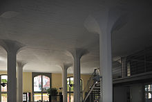 Maillart is known also for his revolutionary column design in a number of buildings. He constructed his first mushroom ceiling for a warehouse in Zurich, together with treating the concrete floor as a slab, rather than reinforcing it with beams. One of his most famous is the design of the columns in the water filtration plant in Rorschach, Switzerland. Maillart decided to abandon standard methods in order to create "the more rational and more beautiful European method of building". Maillart's design of the columns included flaring the tops to reduce the bending moment in the beams between the columns. With the flare, the columns formed slight arches to transfer the loads from the ceiling beams to the columns.
