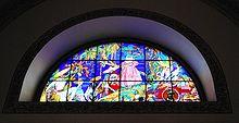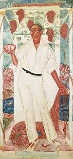 Montenegro's first mural was done while he was living in Mallorca, for the Casino de la Palma.[8][11] He was an early participant in the budding Mexican muralism movement, recruited by Secretary of Education José Vasconcelos and returning to Mexico in 1921.[3][5] His most important mural work is in the former monastery and school of San Pedro y San Pablo, the church portion of which is now the Museo de la Luz.[8] The first mural was done in 1922 called the Arbol de la Vida (Tree of Life) which alludes to the origin and destiny of man. The next was the Fiesta de la Santa Cruz (Festival of the Holy Cross) which depicts a traditional festival related to construction workers on May 3 done between 1923 and 1924.[3] This is considered to be the most important of the murals in this building.[11] Resurrección (Resurrection) was painted between 1931 and 1933. It is a geometric composition with some Cubist influence. In the stairwell of San Pedro y San Pablo, Montenegro painted El Zodíaco (The Zodiac), which was left unfinished in 1923. He came back to it in 1931, finishing it in 1933.[9] In addition to the murals, Montenegro created two stained glass windows influenced by Mexican folk culture called the Jarabe Tapatío (Guadalajara dance) and the La Vendedora de Pericos (The parakeet seller).[3] The work on the building ran into political problems resulting in changed to the original plans. First, Vasconcelos insisted that Montenegro change a depiction of Saint Sebastian, who was partially nude, androgynous and pointing a bow and arrow at the other central figure, a woman, stating it did not represent revolutionary values. In Fiesta de la Cruz, a figure of Vasconcelos was originally included, surrounded by women and holding the flag of the Universidad Nacional de México. When Vasconcelos fell out of favor, this image was painted over and replaced by that of a woman.[11]