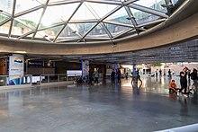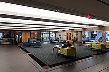 The central block contains provincial government offices and, more recently, portions of the University of British Columbia's downtown satellite campus, UBC Robson Square, housed in the lower level. Above, three cascading waterfalls throughout the complex provide natural air conditioning with 850,000 US gallons (3,218 m3; 707,773 imp gal) of water.[4] An outdoor skating rink is located at the lower level that extends below Robson Street and connects to the northern block with the Vancouver Art Gallery, which was renovated as part of the project.