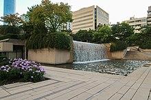 Typical of Erickson's designs, Robson Square is constructed primarily out of concrete, but softened by its environmental design. In addition to the water features are trees and other flora as well as gradually inclining stairs with an integrated ramp.[5] The open design allows for relatively unobstructed natural light and fresh air, and the waterfalls divert from the noise of downtown traffic. Landscaping on the project was designed by Cornelia Oberlander.