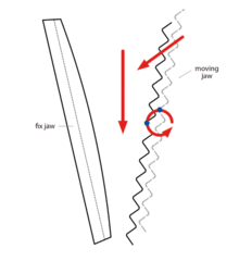 A jaw crusher uses compressive force for breaking of particle. This mechanical pressure is achieved by the two jaws of the crusher of which one is fixed while the other reciprocates. A jaw or toggle crusher consists of a set of vertical jaws, one jaw is kept stationary and is called a fixed jaw while the other jaw called a swing jaw, moves back and forth relative to it, by a cam or pitman mechanism, acting like a class II lever or a nutcracker. The volume or cavity between the two jaws is called the crushing chamber. The movement of the swing jaw can be quite small, since complete crushing is not performed in one stroke. The inertia required to crush the material is provided by a flywheel that moves a shaft creating an eccentric motion that causes the closing of the gap.