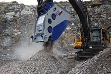 A crusher bucket is an attachment for hydraulic excavators. Its way of working consists on a bucket with two crushing jaws inside, one of them is fixed and the other one moves back and forth relative to it, as in a jaw crusher. They are manufactured with a high inertia power train, circular jaw movement and an antiestagnation plate, which prevents large shredding pieces from getting stuck in the bucket's mouth, not allowing them to enter the crushing jaws. They have also the crushing jaws placed in a cross position. This position together with its circular motion gives these crusher buckets the faculty of grinding wet material.